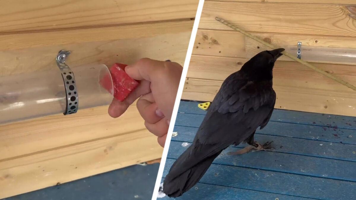 De meeste huisdieren doen alles voor een snoepje, maar deze kraai bewijst dat hij zelfs redelijk ingewikkelde problemen op kan lossen. Als er maar wat te vreten is!