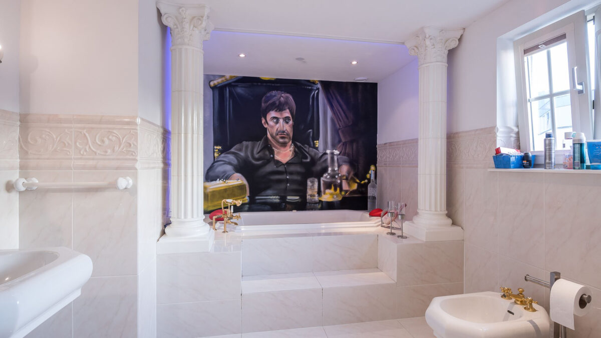 Als je teveel geld en slechte smaak combineert krijg je vaak wanstaltige dingen. Dit pareltje van een woning is daar een voorbeeld van. Voor slechts 595.000 euro ben jij de eigenaar van 238 vierkante meter woongenot in Schiedam, mét muurschildering van een schele Tony Montana met downsyndroom boven je bad. Je wist niet dat je het wilde.