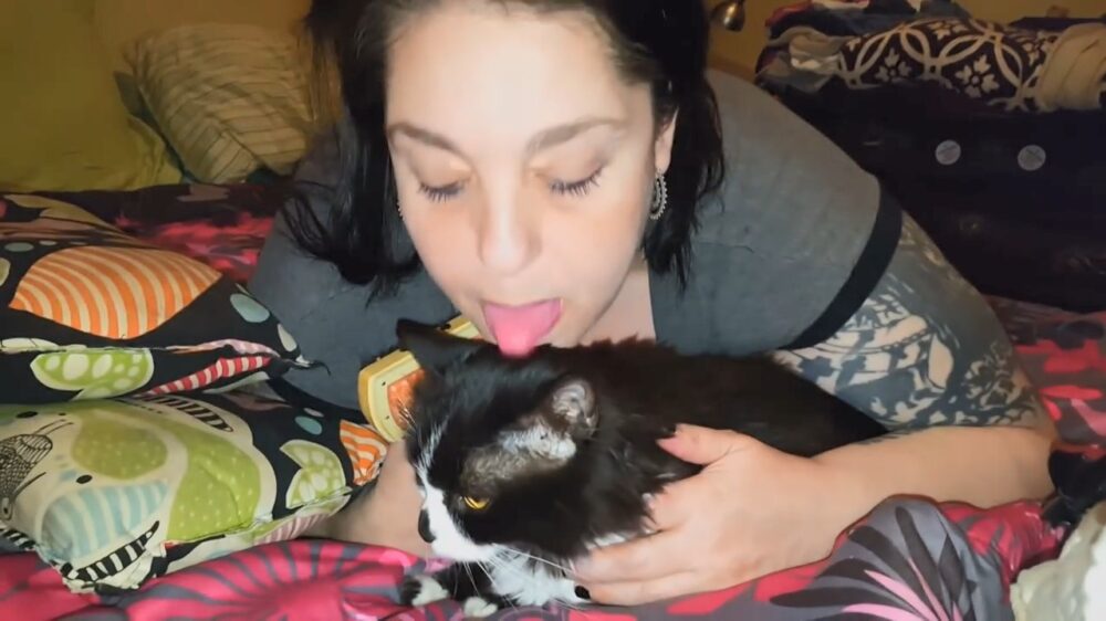 Gekke kattendame verzorgt haar katten door ze af te lebberen