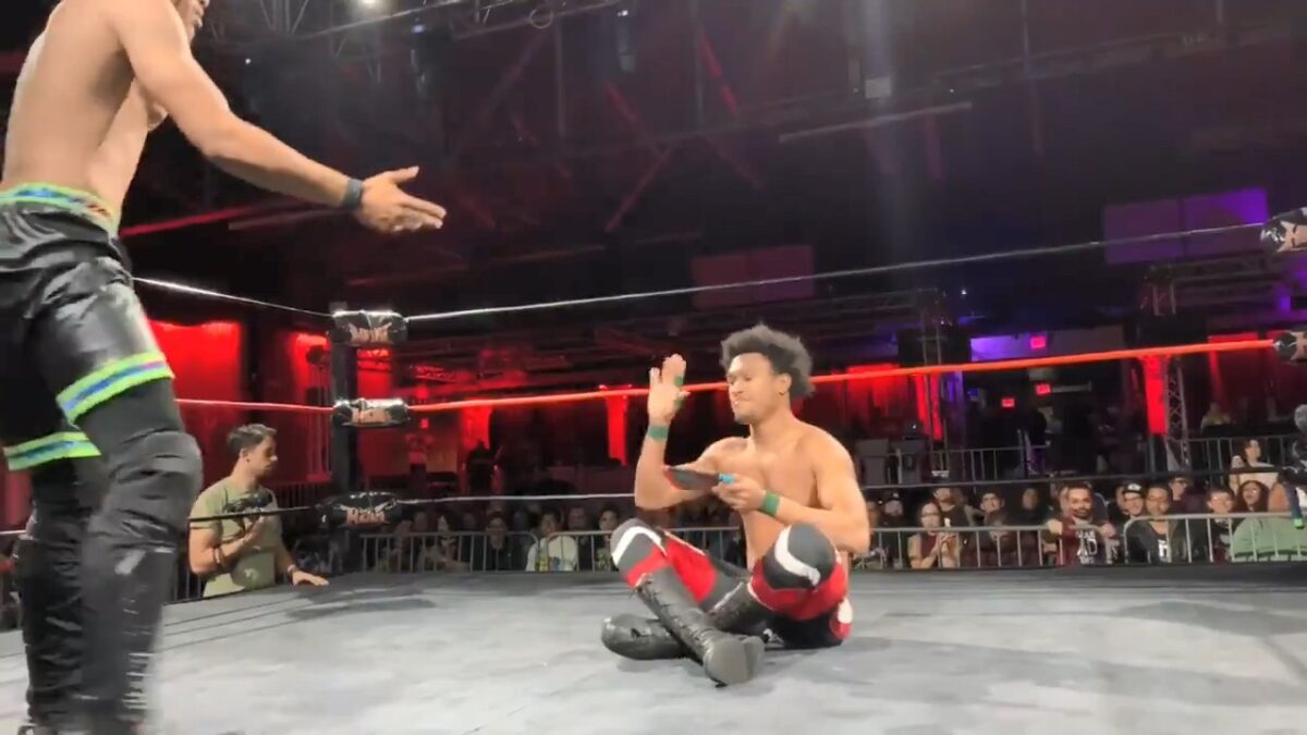 Worstelaar speelt rustig op zijn Nintendo Switch terwijl hij zijn tegenstander verslaat