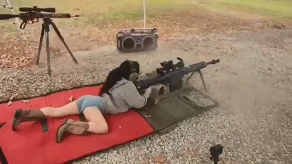 Ieniemienie ervaart gigantische terugslag van een scherpschuttersgeweer groter dan haarzelf Fun