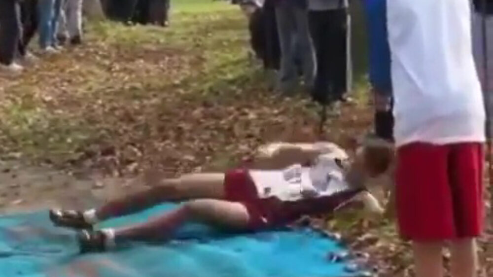 Hardloopster is zo moe dat ze maar gewoon over de finish rolt