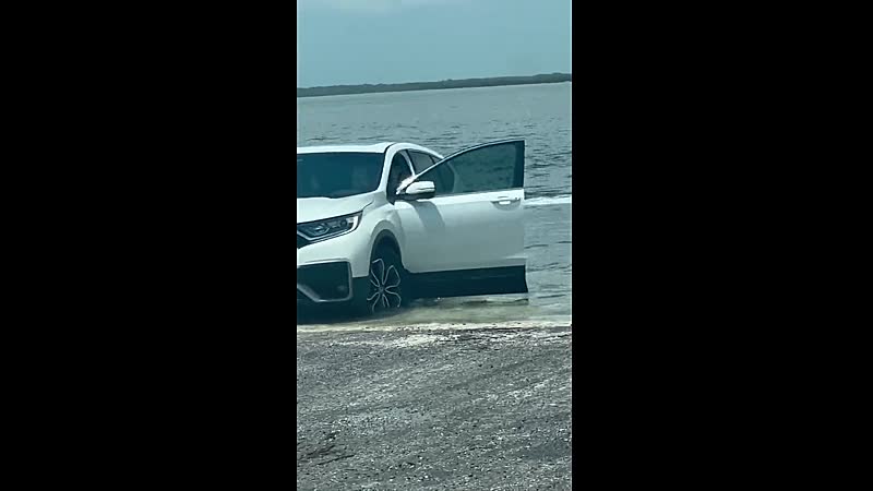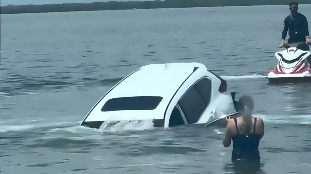 Vrouw kijkt pijnlijk toe hoe haar auto langzaam de zee in wordt getrokken