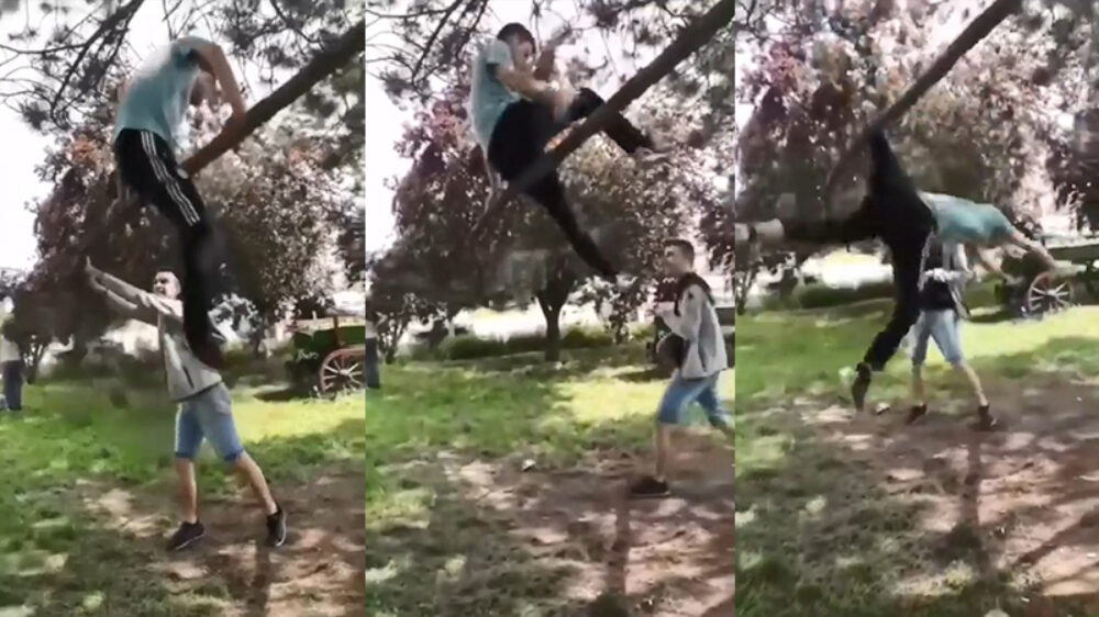 Kneusje die boom probeert te slopen wordt aardig voor lul gezet