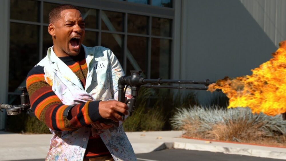 Een vlammenwerper is altijd stoer en al helemaal in de handen van legend Will Smith. Naast zonne grote vuurbal moeten een aantal meloenen het ook ontgelden.