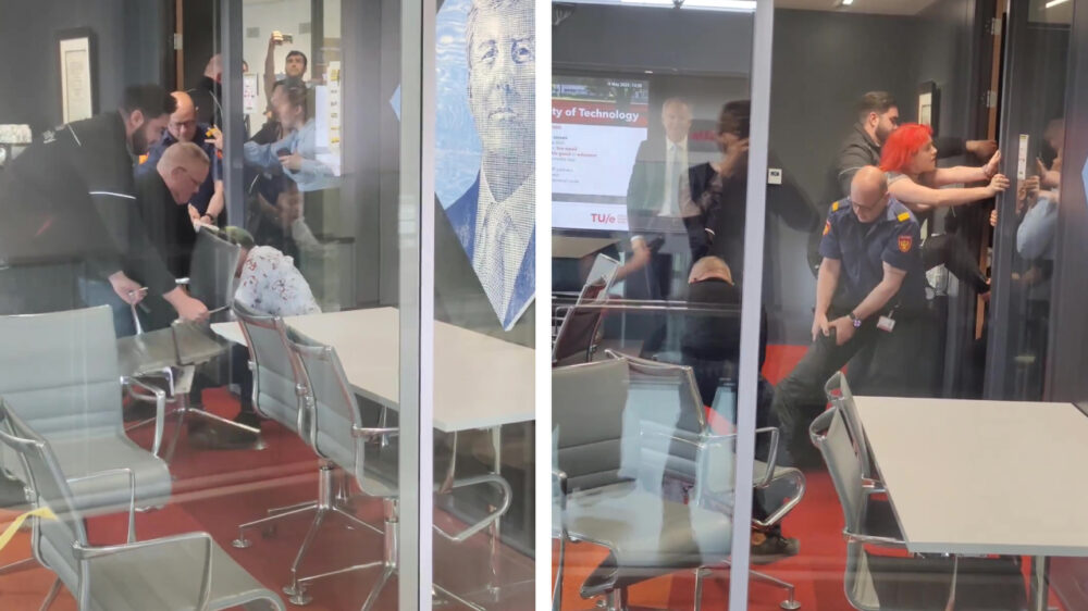 Demonstranten Extinction Rebellion hardhandig uit bestuurskamer van de TU Eindhoven gezet