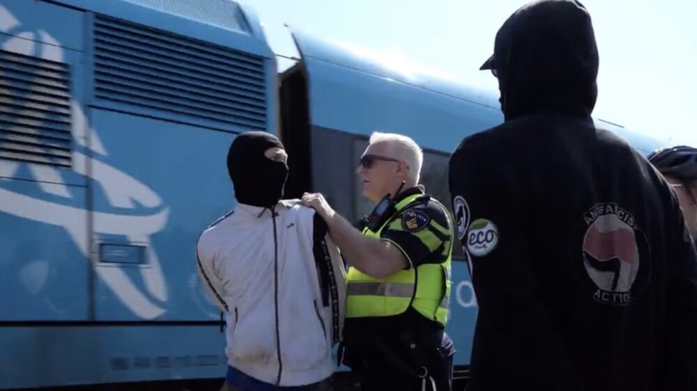 De linkse basisdemocratische organisatie tegen kapitalisme, patriarchaat, racisme en ecologische vernietiging heeft een video online gezet hoe een politieagent een gearresteerde activist bij een spoorwegovergang begeleidt, waar de slagbomen naar beneden zijn en het rode licht aan is. Op dat moment komt er net een trein met hoge snelheid aan denderen waardoor de agent, volgens Tim Hofman, de man 'bijna een trein laat koppen'.