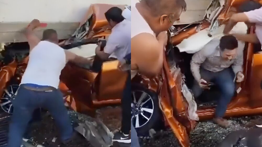 De auto zat bekneld tussen twee vrachtwagens op de snelweg Frontera-Villahermosa in de staat Tabasco. Ondanks deze bizarre klapper kan de bestuurder het gewoon nog navertellen. Sterker nog; hij kruipt er zonder kleerscheuren uit. Dit is echt wat je noemt een geluk bij een ongeluk.