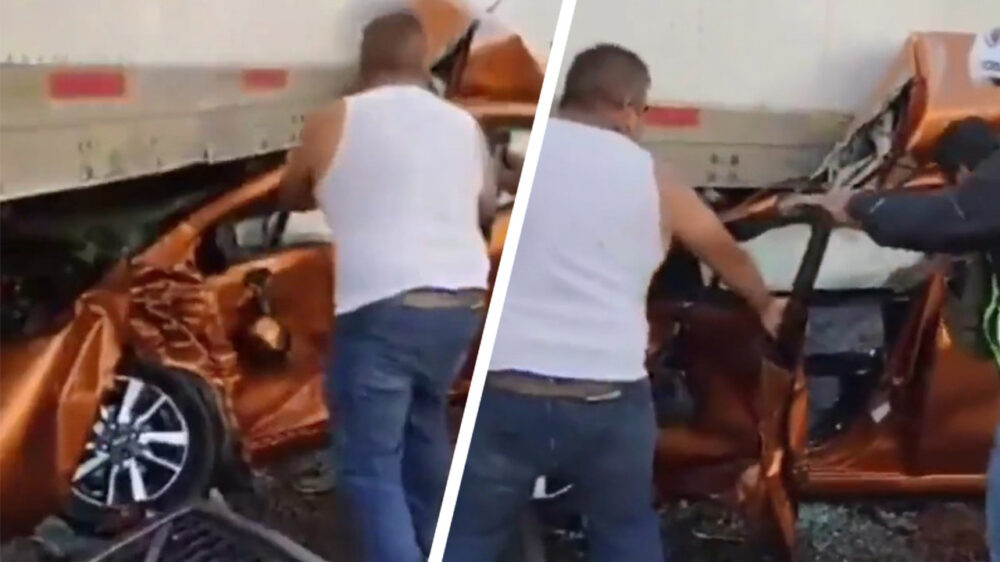 De auto zat bekneld tussen twee vrachtwagens op de snelweg Frontera-Villahermosa in de staat Tabasco. Ondanks deze bizarre klapper kan de bestuurder het gewoon nog navertellen. Sterker nog; hij kruipt er zonder kleerscheuren uit. Dit is echt wat je noemt een geluk bij een ongeluk.