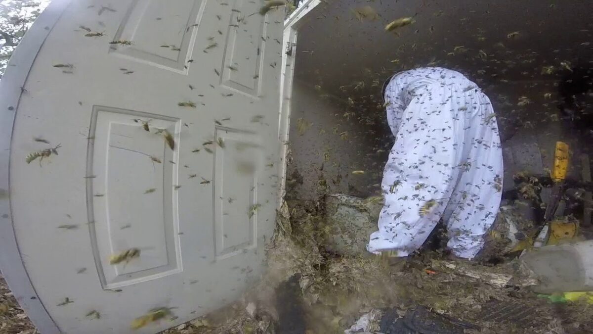 De meeste mensen worden vrij panisch als er één klein wespje in de buurt van ze vliegt, laat staan als ze dit enorme terrornest in hun schuur tegenkomen...
