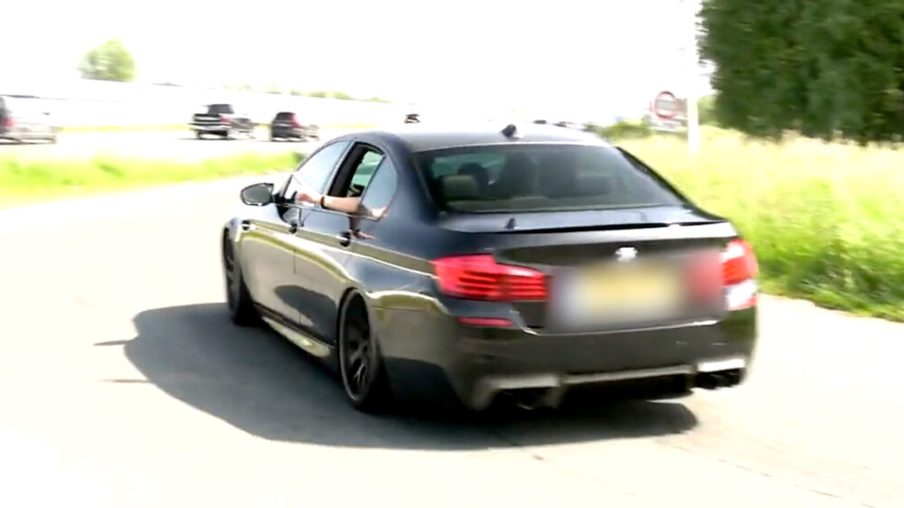 Iets te enthousiaste automobilist drift zijn dikke BMW M5 bijna de berm in