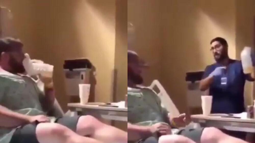 Dorstige kerel pakt verkeerde fles en krijgt een iets te zout drankje binnen