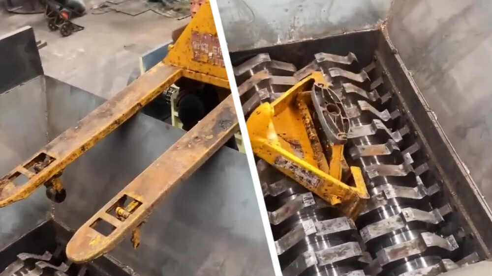 Als je iets écht compleet wil slopen dan kun je het het beste in de shredder gooien, want met het grootste gemakt sloopt dat ding zelfs de grootste palletwagen!