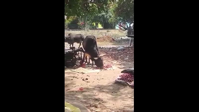 Fruitverkoper wordt door een agressieve stier de lucht in geslingerd