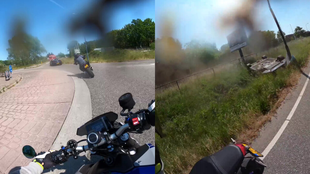 Voor de bestuurder van deze BMW M6 cabrio ging het gisteren bij Sprang-Capelle goed mis toen zijn auto uitbrak, over de kop sloeg en in de berm belandde. Deze motorrijder zat eerste rang en kon direct te hulp schieten, waarbij hij een toevallig voorbijrijdende ambulance meteen aan kon houden. De bestuurder kon ter plekke worden behandeld aan wat lichte verwondingen.