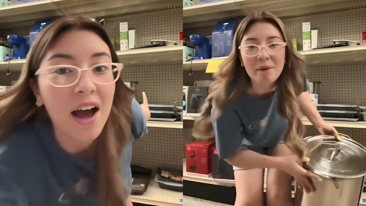 Keukenprinses test akoestiek van haar nieuwe pan voordat ze hem aanschaft