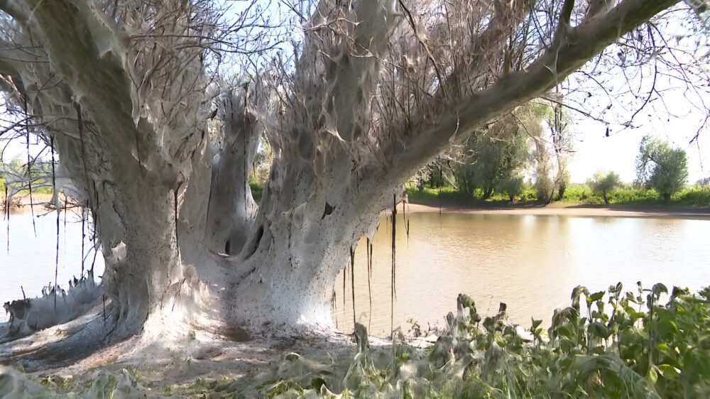 Vergeet de eikenprocessierups, want diep in het hartje van Beneden-Leeuwen (Gelderland) staat een wilg die klaar lijkt te zijn voor een rol in een Halloweenfilm. Volgens Rob Puijker, onze betrouwbare gids bij het 'Instituut voor Natuurbeschermingseducatie', is dit een "buitensporig voorbeeld van de invasie van de spinselmot".