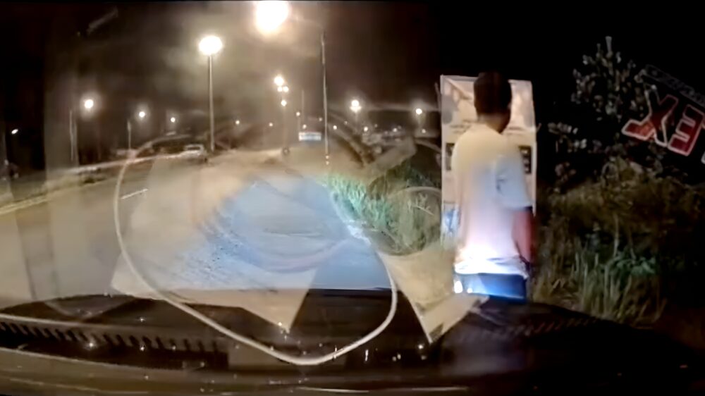 Op zich valt het natuurlijk wel mee als je niet per se in de spotlights van al die passerende auto's wil staan, maar zet dan op z'n minst je alarmlichten aan want anders zijn er blijkbaar idioten die vol achterop klappen. Ondanks de harde klap komt 'ie er met slechts wat kleerscheuren vanaf.