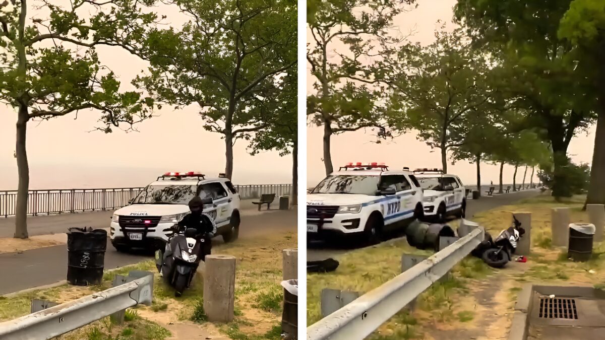 In de New Yorkse wijk Brooklyn werd een scooterdief gespot door de politie, maar in plaats van remmen en meewerken besloot deze mafkees er als een haas vandoor te gaan. De politie ging er volle bak achteraan en de 17-jarige dief liet zien niet over de allerbeste stuurmanskunsten te beschikken toen hij kogelhard tegen een vangrail klapte.