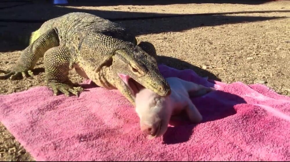 Dit is Rex, een Indische varaan met honger. Vandaag op het menu: speenvarken.