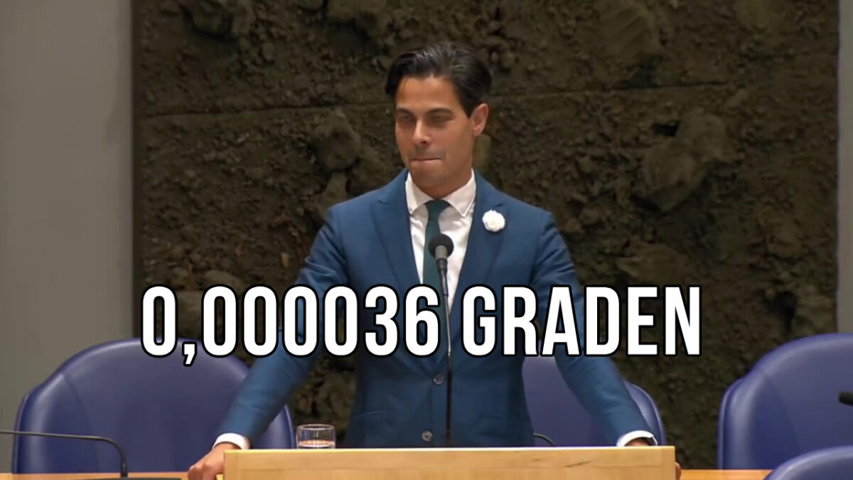 We herhalen het even voor die mensen achterin de zaal: nul komma nul nul nul nul drie zes graden. We snappen nu dat Rob Jetten zijn lach bijna niet meer in kon houden.