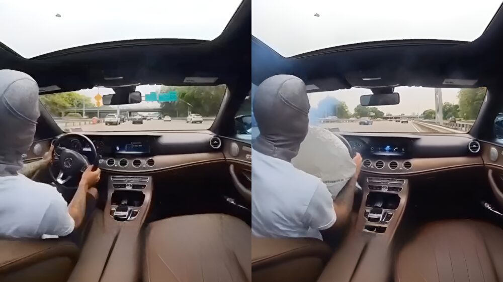 Idioot racet in zijn Mercedes over de snelweg en verliest controle over het stuur