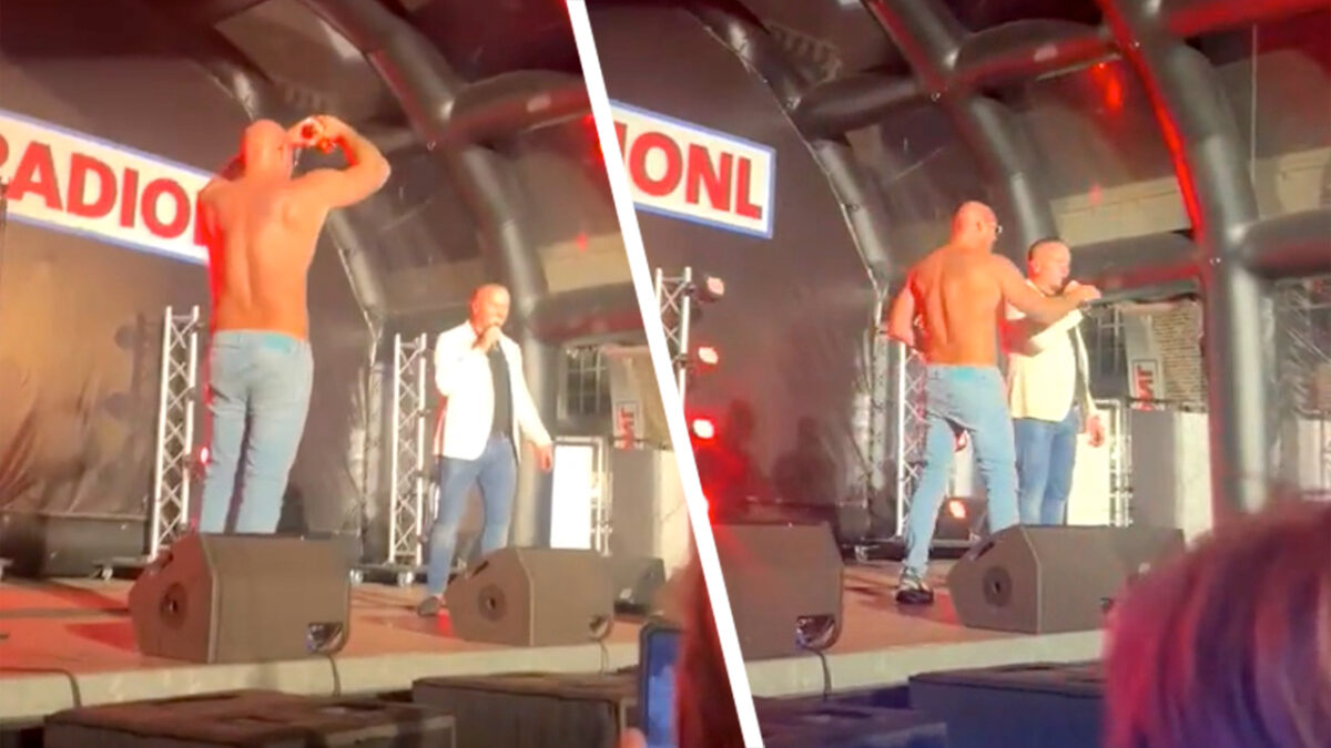 Alex Soze klimt op podium tijdens optreden Frank van Etten op het TT Festival