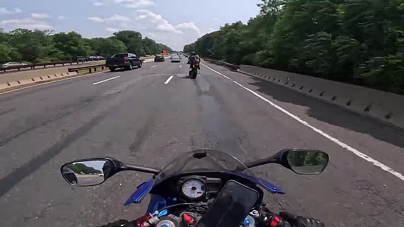 Je zou denken dat het om een Belgische snelweg gaat, maar we hebben hier gewoon met een slecht onderhouden wegdek in de States te maken. Als deze motorrijder even omkijkt en niet goed oplet begint zijn fiets uit het niets te slingeren en gaat 'ie hard onderuit.