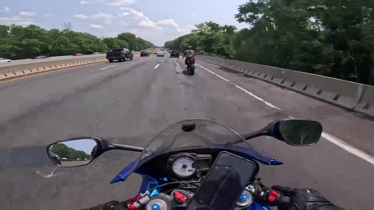 Je zou denken dat het om een Belgische snelweg gaat, maar we hebben hier gewoon met een slecht onderhouden wegdek in de States te maken. Als deze motorrijder even omkijkt en niet goed oplet begint zijn fiets uit het niets te slingeren en gaat 'ie hard onderuit.