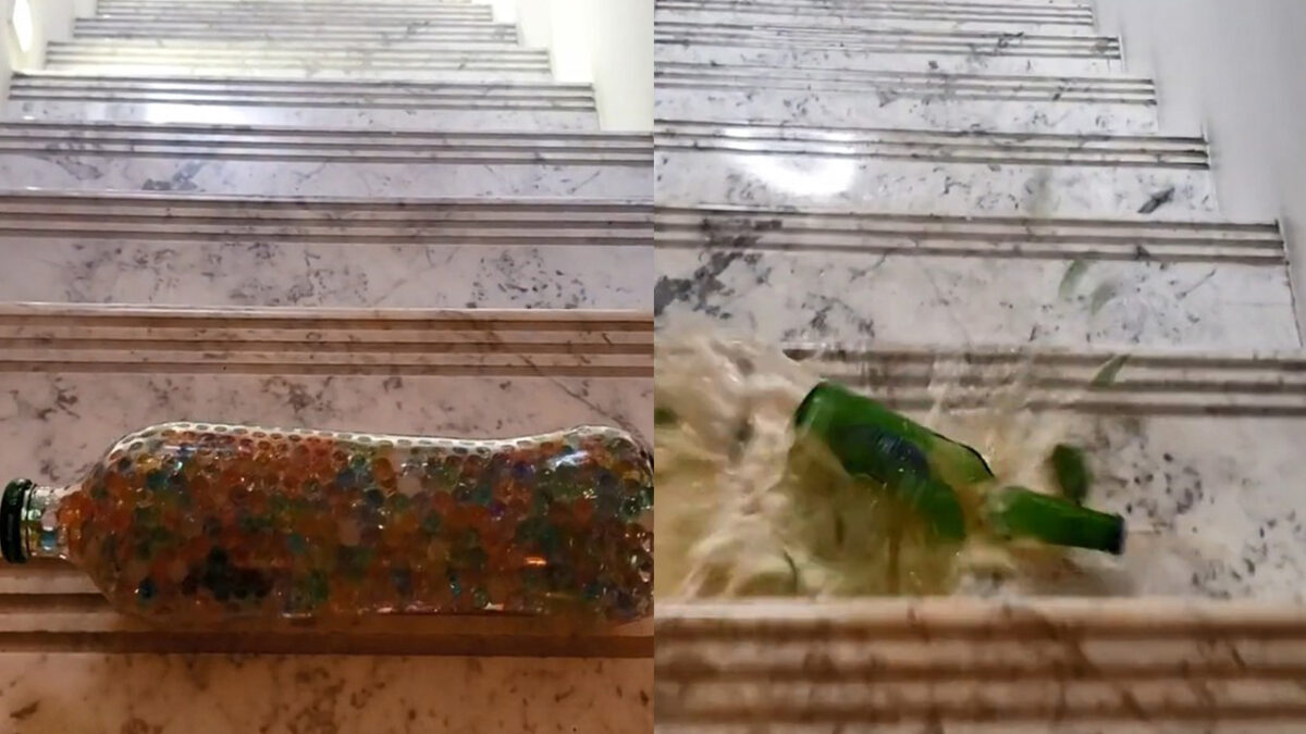Soms verveel je jezelf de pleuris en krijg je ineens het fantastisch idee om allerlei glazen potten en flessen van je marmeren trap te rollen om te kijken of ze kapot gaan. Succes met opruimen, keer op keer op keer.