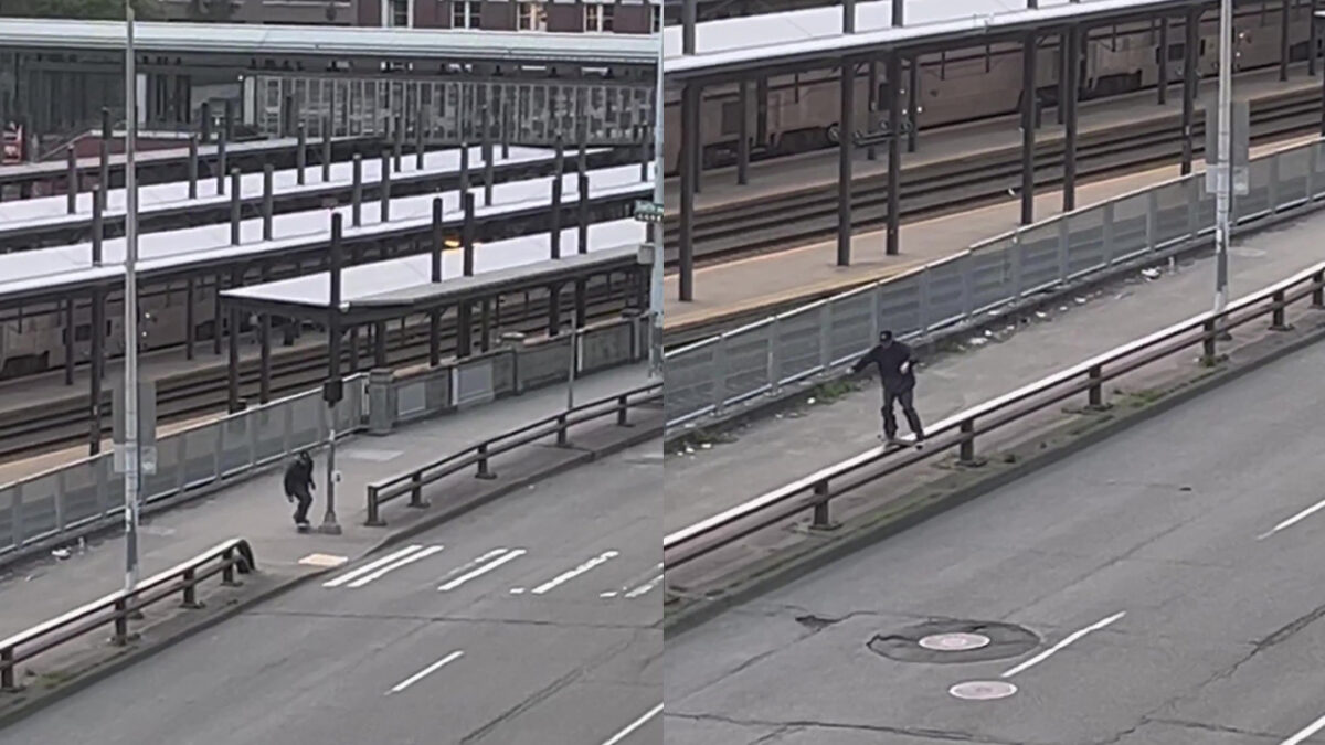Skateboarder Michael Patterson gooit er een meterslange boardslide uit