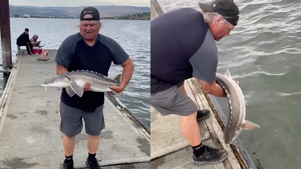 Als visser mag je best trots zijn als je zo'n steur hebt gevangen! Oké pa, we hebben het op video dus gooi hem nu maar weer terug het water in!