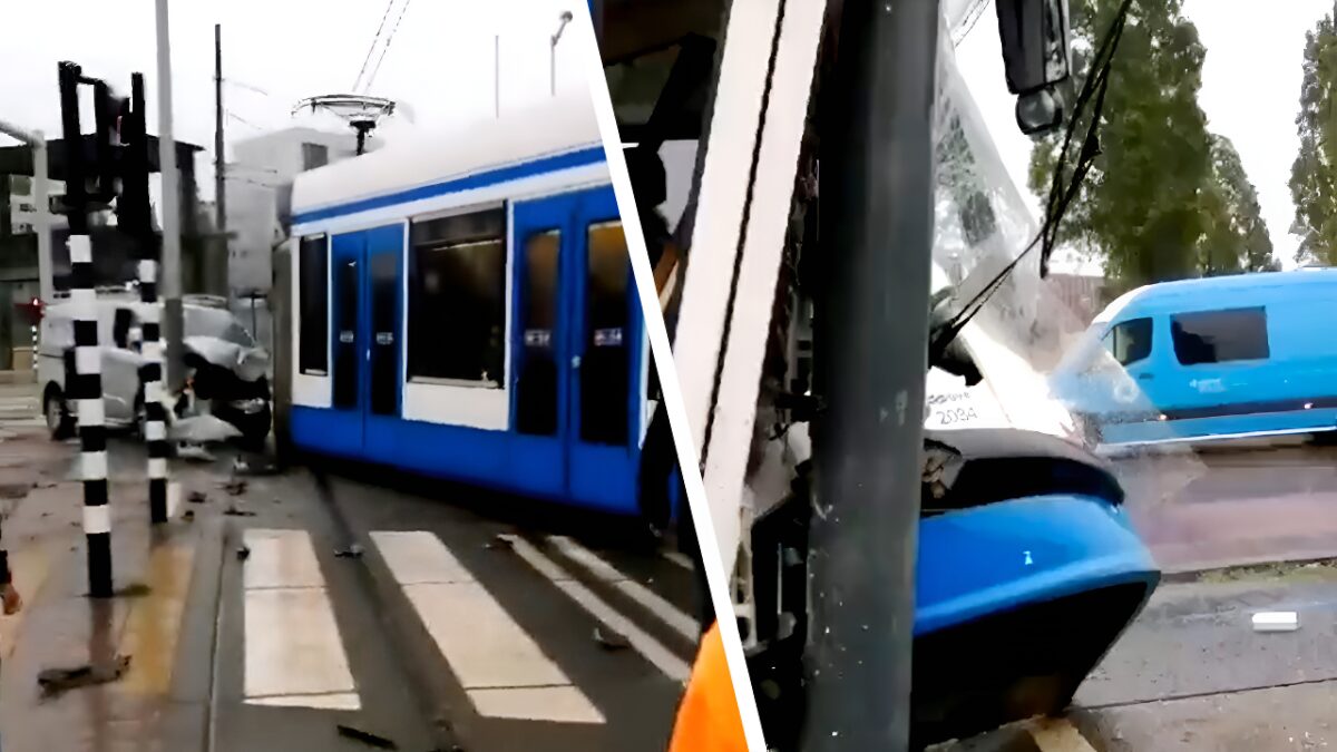 Tram in Amsterdam kopt bovenleidingsmast dankzij botsing met auto