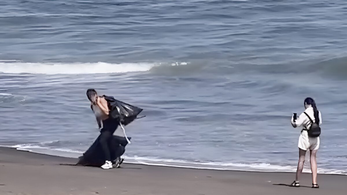 Influencer doet net alsof ze in d'r eentje het strand van Bali opruimt