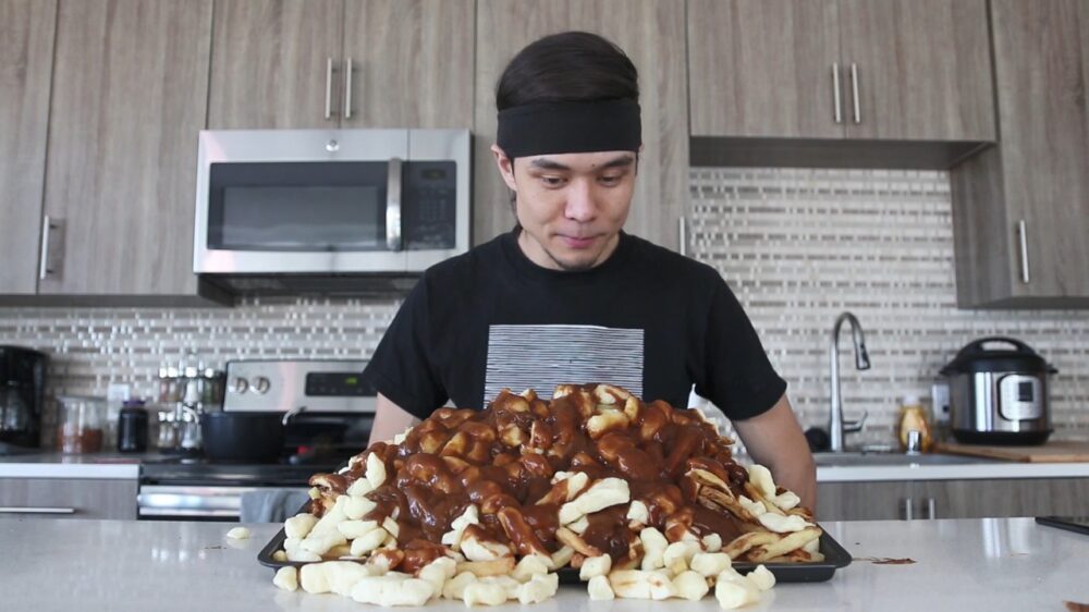 Wedstrijdeter Matt Stonie probeert bijna 6 kilo 'poutine' te eten op deze brakke zondagmiddag