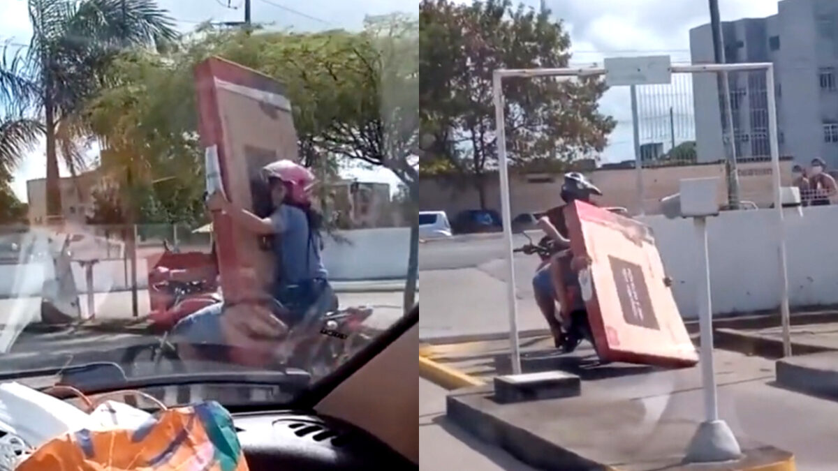 Waarom zou je de moeite nemen én extra kosten maken door een busje te huren om je nieuwe tv op te halen als je ook een brommer en een vriendin hebt? Pas op: poortje.