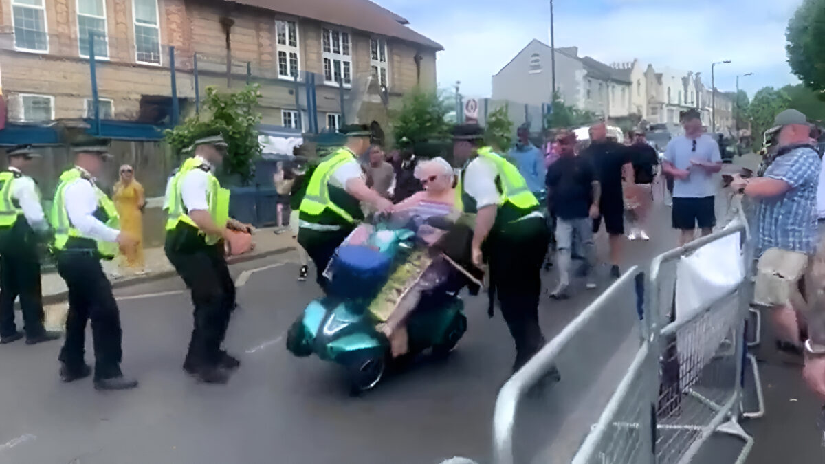 Hoe dan ook, tijdens een pride-demonstratie in het Londense district Lewisham probeerde een oudere vrouw in een scootmobiel haar mening duidelijk te maken door op een grote groep pro-demonstranten in te rijden. Echter stonden er op de route nog wel wat agenten in de weg.