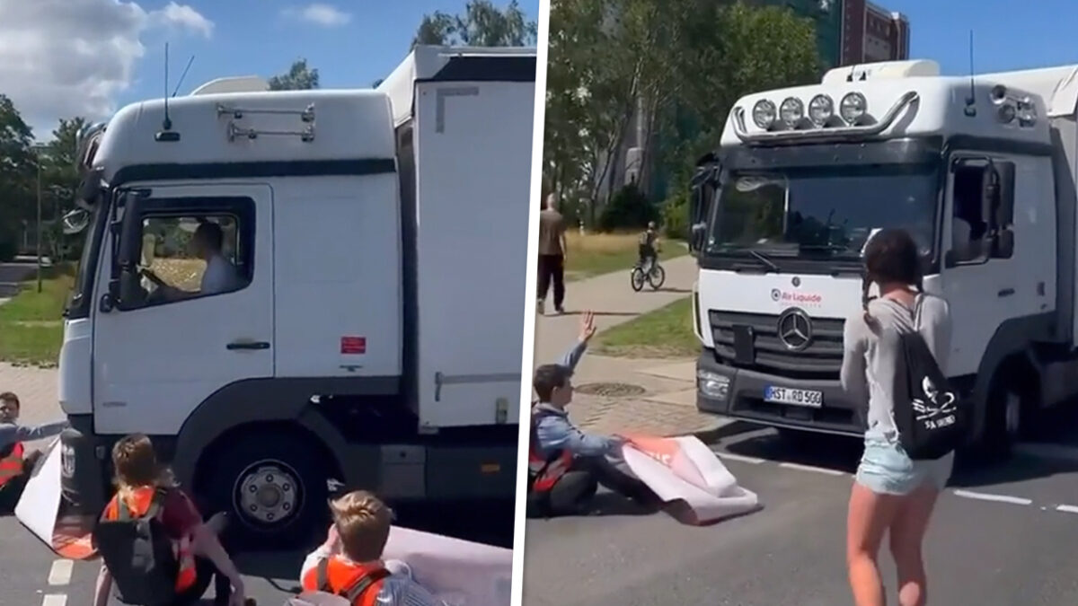 We gaan nog even door in de categorie klimaatactivisten, want deze video van een boze vrachtwagenchauffeur gaat namelijk ook rond op de interwebs. Enkele activisten in Duitsland vonden het namelijk de hoogste tijd om weer eens op de weg te gaan zitten, maar hadden niet gerekend op deze boze chauffeur. Die had er namelijk géén zin, sleurde ze van de weg en reed bijna over ze heen.