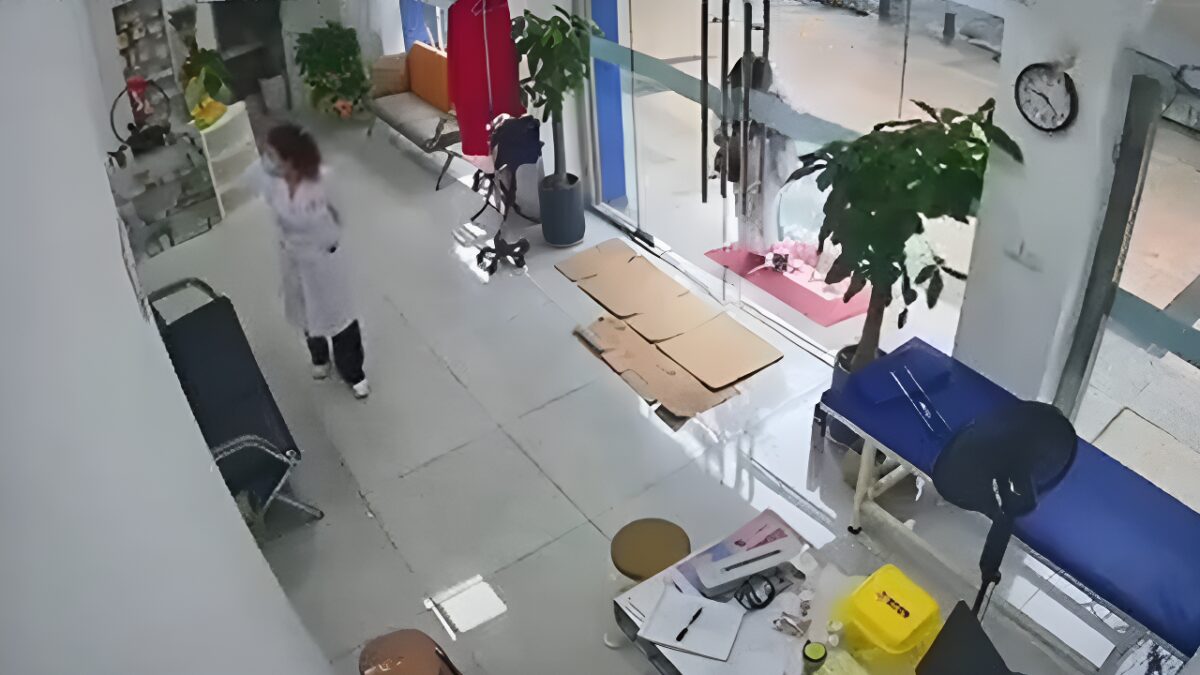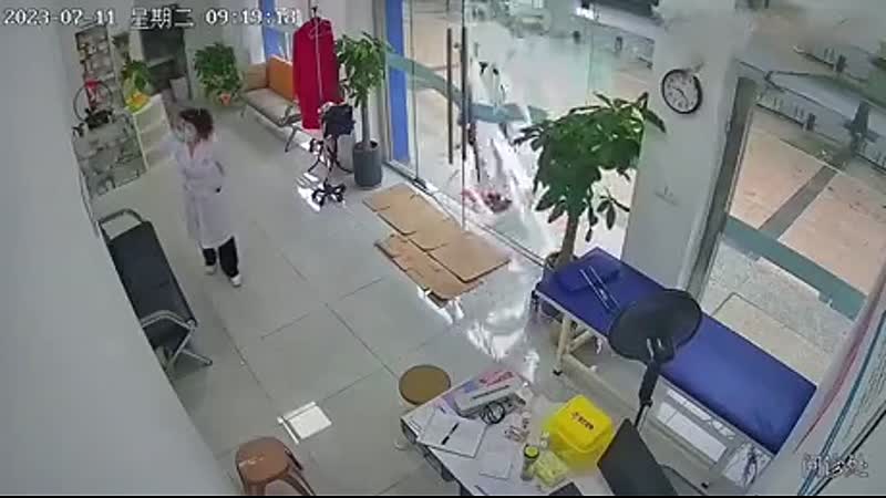 Een vrouw dacht even een kliniek in Lianyungang, Jiangsu, binnen te lopen, maar plotseling begeeft een glazen deur made in China het en de andere glazen deur komt op de poffer van een dokter. Niemand raakte zwaar gewond en gelukkig was er snel een dokter in de zaal.