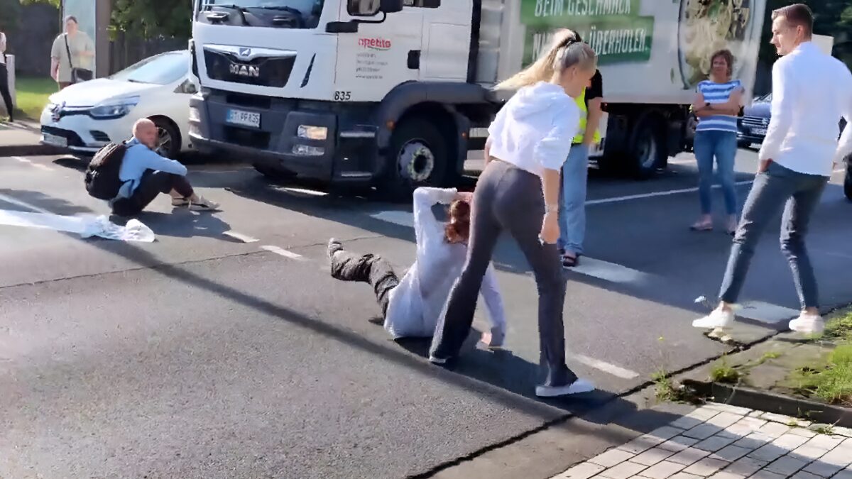 In Duitsland lijkt het aantal wegblokkerende klimaatactivisten de spuigaten uit te lopen, want nadat er onlangs al eentje bijna omver werd gereden lijken deze weggebruikers er ook helemaal klaar mee te zijn. Vooral de blonde dame in kwestie, die de blokkerende vrouwen aan hun haren de straat afsleept.