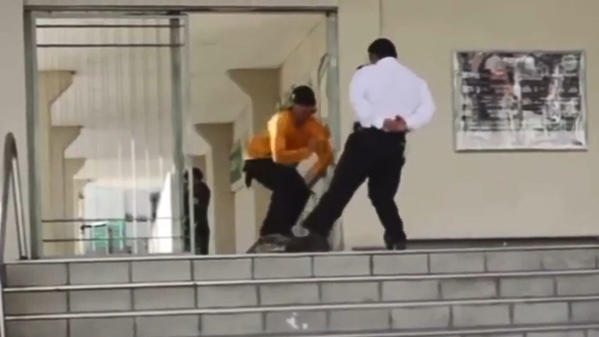 Na eerst te hebben gewaarschuwd wacht de beveiliger het juiste moment af om de skater een wijze les te geven. Wie niet luisteren wil moet maar betonhappen!