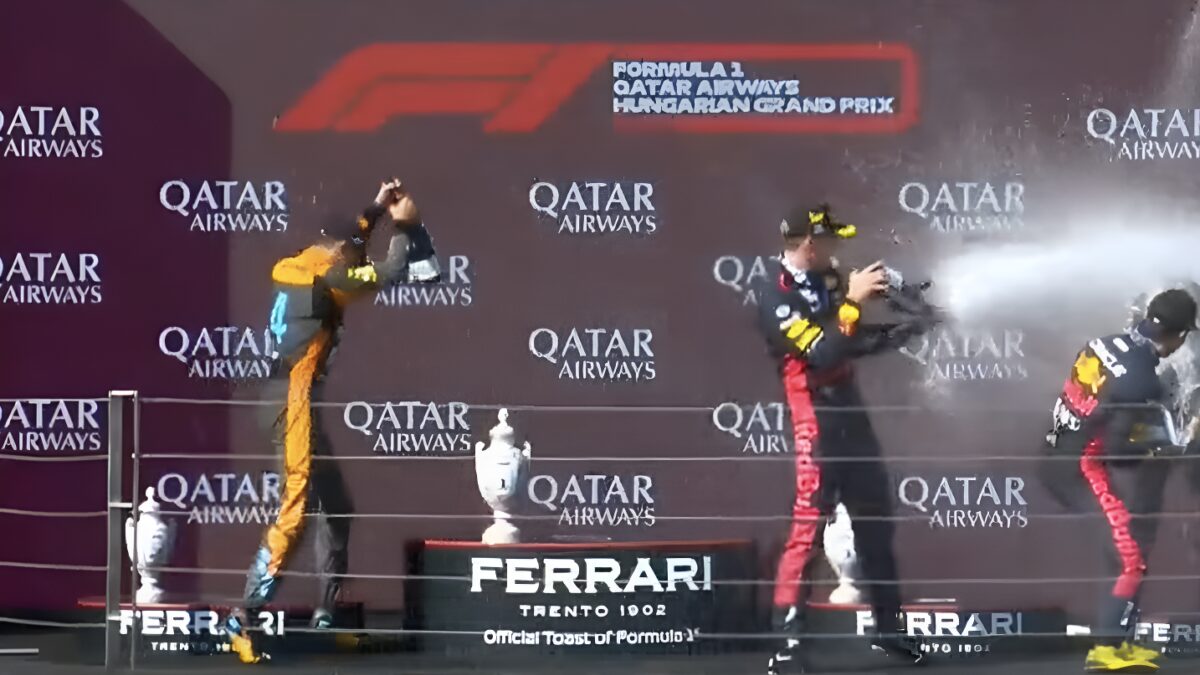 Het moment dat Lando Norris de Hongaarse bokaal van Max Verstappen sloopte