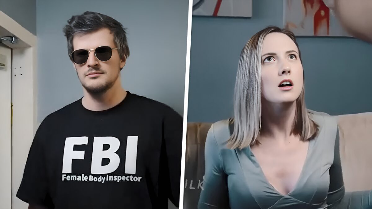 Deze vrouwelijke lichaamsinspecteur neemt zijn werk uiterst serieus. Sjonge jonge, lekker kinderachtig weer zeg.
