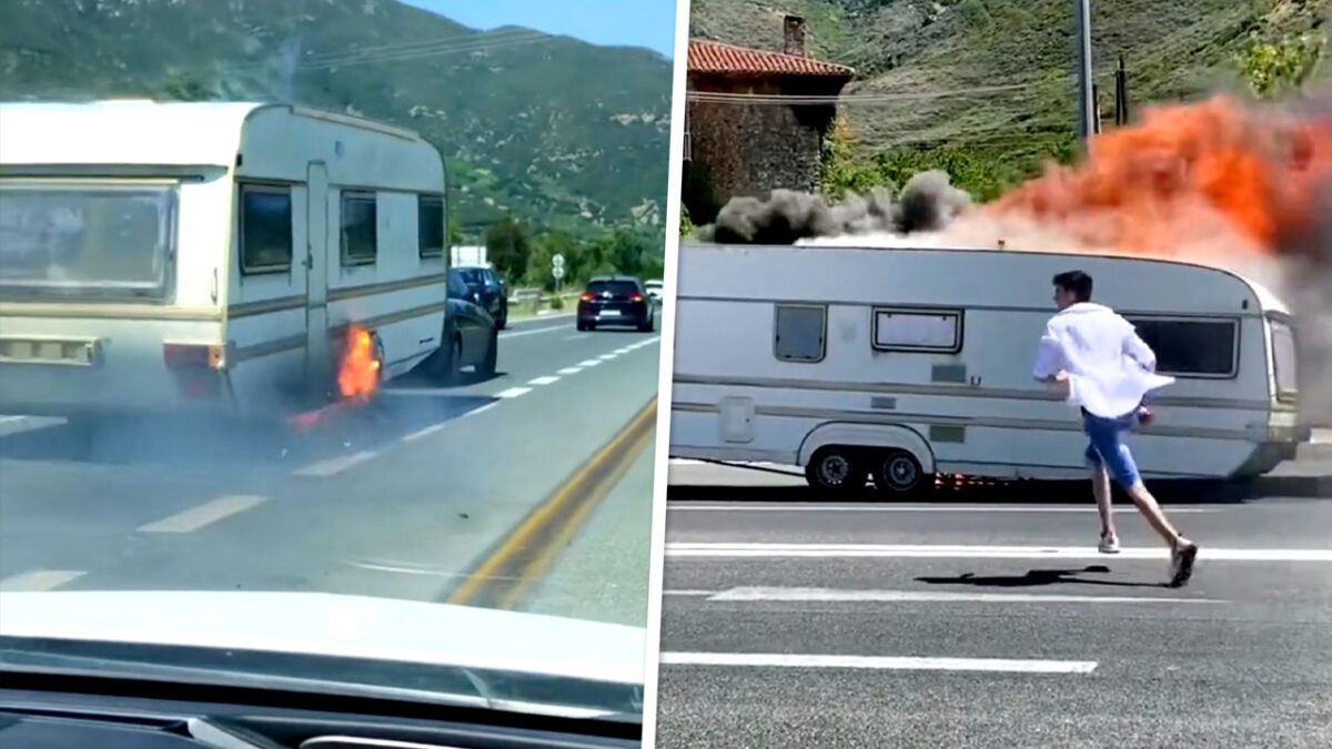 Niet alleen elektrische auto's hebben de neiging om spontaan in brand te vliegen, ook caravans sleurhutten vatten blijkbaar 'spontaan' vlam en dan kun je hem toch echt even beter aan de kant van de weg zetten want dan valt er misschien nog iets te redden. Maar goed, zelf weten natuurlijk.