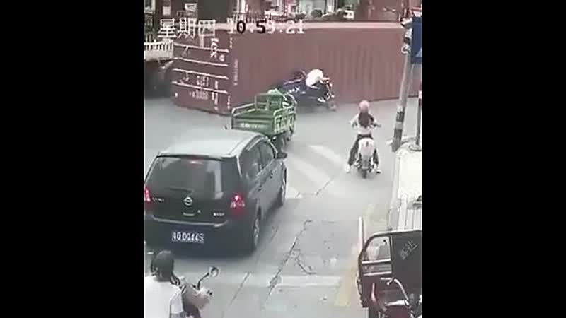 Een container van enkele tonnen stortte op de weg en verpletterde bijna een Chinese man en z'n brommert. Wedden dat 'ie meteen is doorgereden om een staatslot te kopen!?