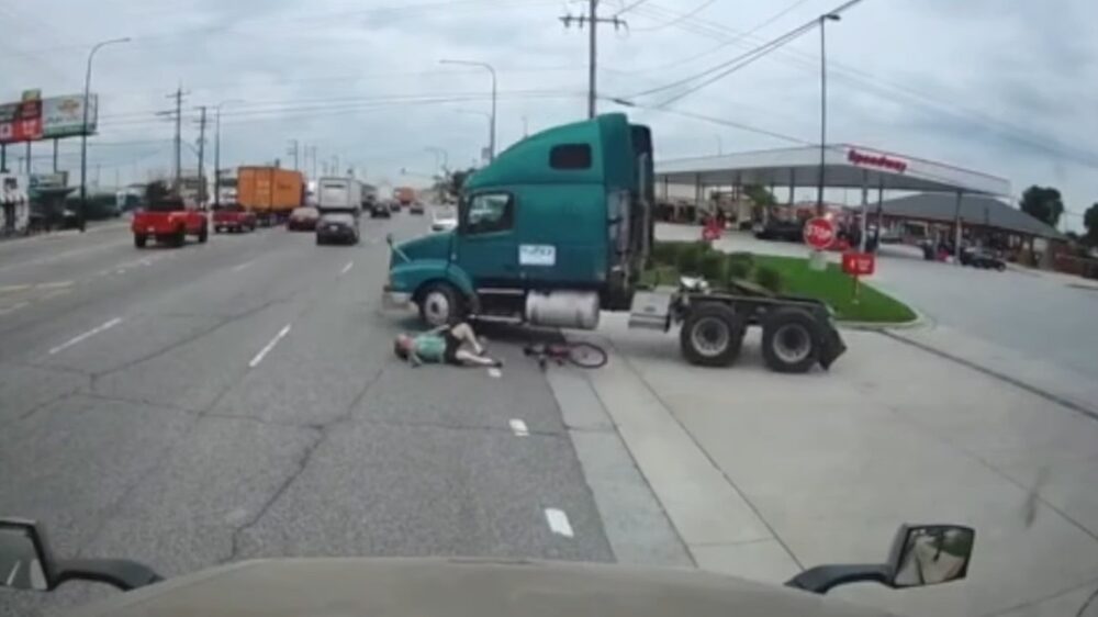 Fietser wordt bijna geplet als een vrachtwagenchauffeur hem over het hoofd ziet