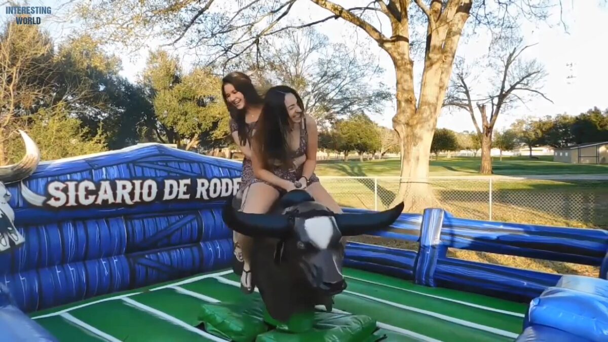 Vriendinnen worden flink door elkaar geschud op de mechanische stier Fun