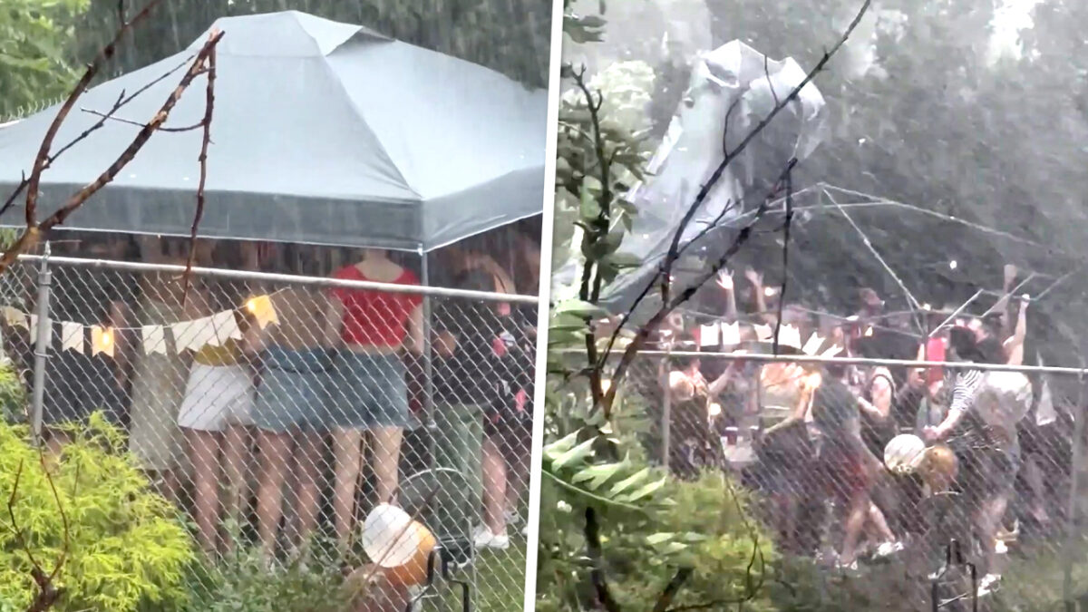 Dat een partytent in theorie niet de beste plek is om te schuilen voor een storm hoef je de meeste Nederlanders waarschijnlijk niet uit te leggen. Deze groep Amerikanen dacht daar klaarblijkelijk anders over, maar één ding is zeker: het dak ging er letterlijk en figuurlijk vanaf.