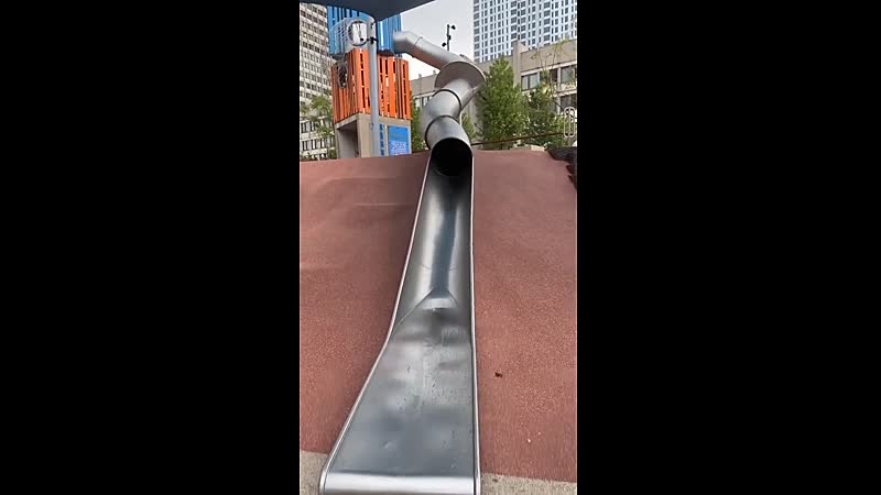 Een politieagent controleert hoe gevaarlijk de nieuwe glijbaan is
