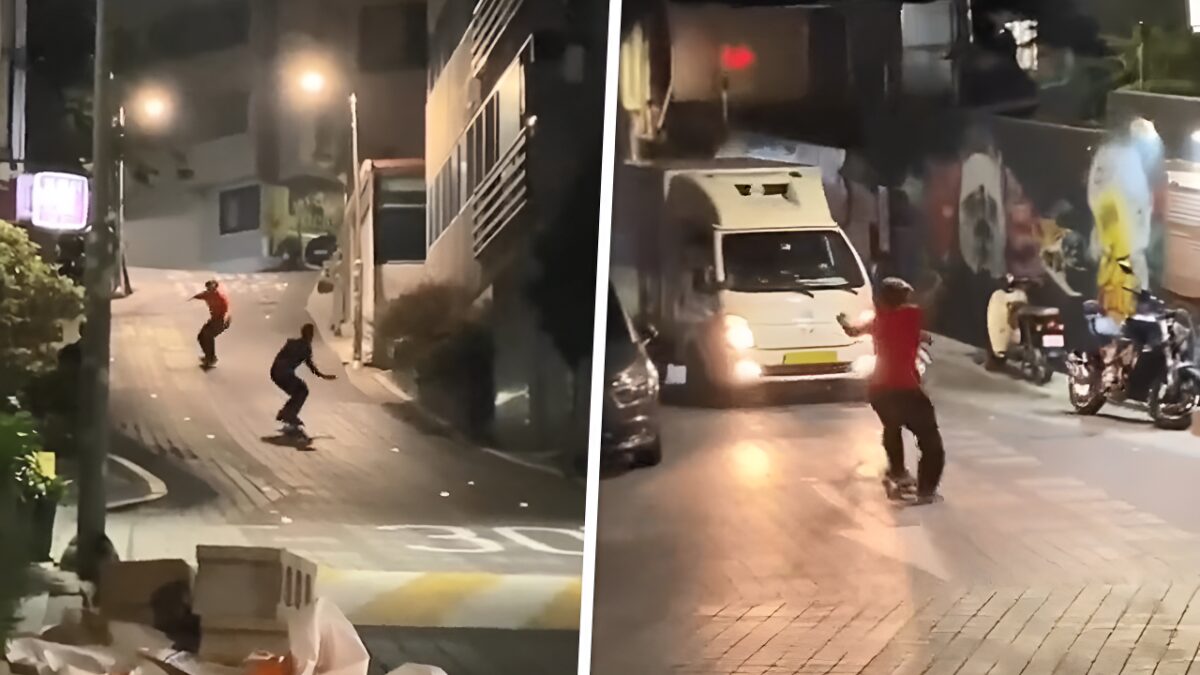Skateboarders krijgen een onverwacht verkeersobstakel voor hun kiezen
